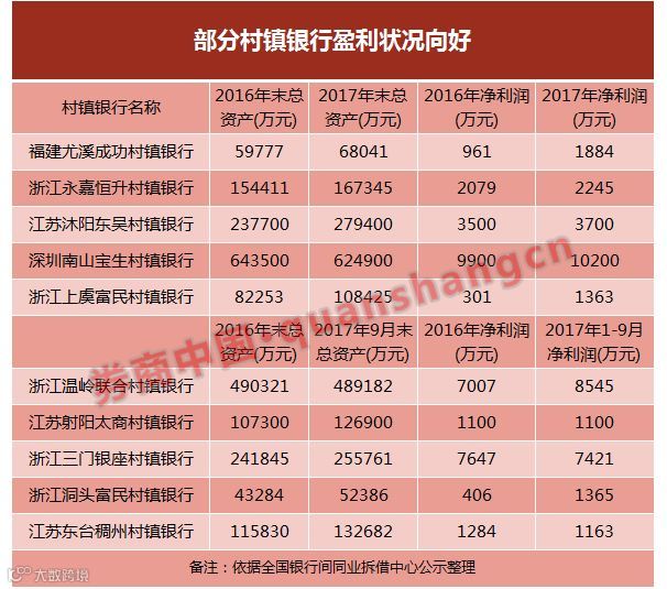 尤其是在2017年,经济形势向好等多因素带来了多家村镇银行净利润爆发式增长。比如福建尤溪成功村镇银行净利润同比增了2倍;2017年1月-9月,浙江洞头富民村镇银行净利润同比2016年增长了3倍有余。
