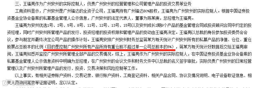 证监会表示,虽然私募基金管理人备案信息上王福亮被登记为总经理,但是从公司的会议纪要、盖章资料、产品合同签字等多个方面,还有广州安州多名投资经理、交易员及研究部员工的相关询问笔录,均指认王福亮为广州安州实际控制人,负责产品投资交易决策等业务。