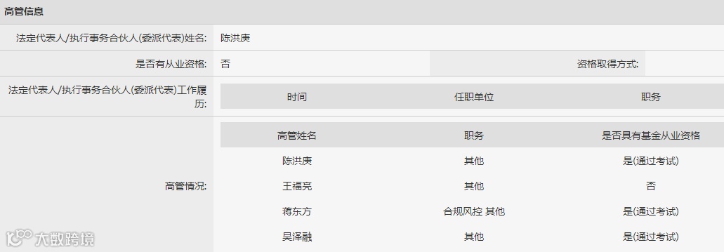 从备案信息可以看到,公司的法定代表人叫陈某庚,王福亮在公司高管之列,并不具备基金从业资格。