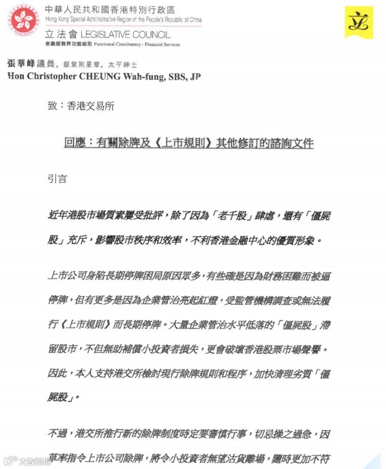 香港立法会议员张华峰表示,支持港交所检讨现行除牌规则和程序,加快清理劣质“僵尸股”。港交所在推行新的除牌制度时,切忌操之过急。如果草率指令上市公司除牌,将令小投资者无望沽货离场,更加不符股民利益。对于需要物色白武士度难关的上市公司,要求他们快速除牌亦于理不合。