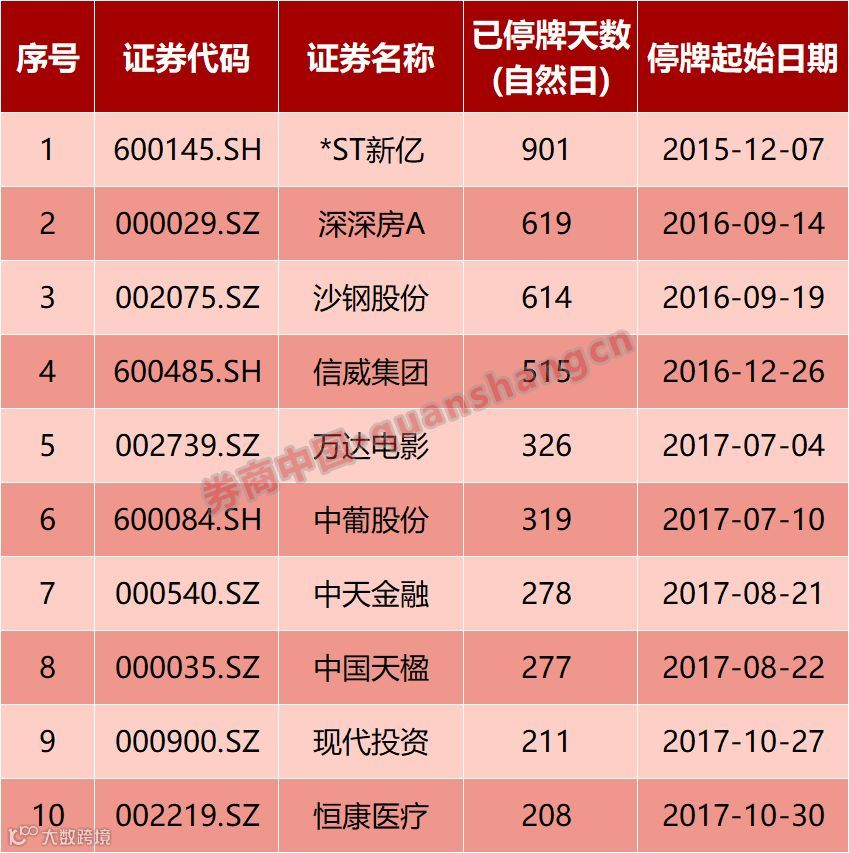 A股市场长期停牌的股票不少,目前停牌超过200天的上市公司有10家,其中,*ST新亿停牌时间已达到901天。