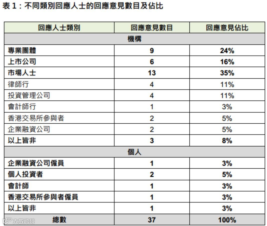 记者获悉,港交所此次共收到 43 份回应意见,分别来自专业团体、市场参与者、上市发行人、业界组织、其他公司实体及个别人士。所有建议均得到大部分回应人士(约 70%或以上)支持 。