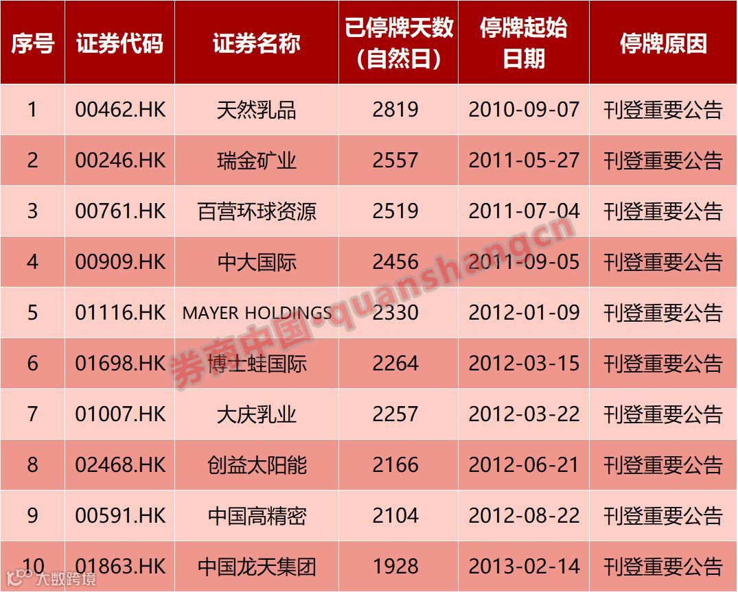 券商中国记者统计,目前,港交所有84家公司处于停牌状态,停牌超过1000个自然日的公司达到32家,其中,天然乳品自2010年9月7日起停牌,停牌时间近8年。