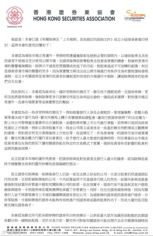 不过,香港证券业协会则明确发表不同看法:原则上,除非在一个非常特殊的情况下,联交所不应轻易将一支证券停牌,更何况是将证券除牌。强制除牌更多只是联交所从自身利益出发的一个低成本选择,对恢复市场正常运作、改善市场质量的并无实质性的帮助。