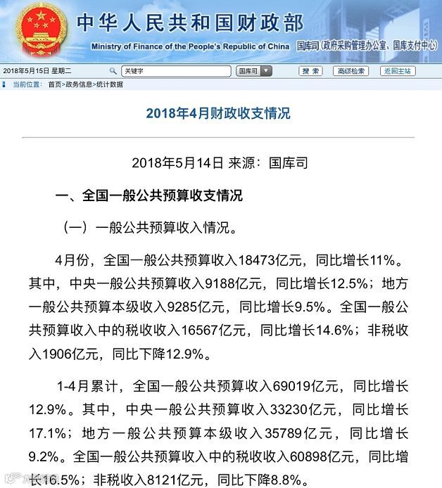 5月14日,财政部国库司公布了今年前4月的财政收支情况,1月-4月累计,全国一般公共预算收入69019亿元,同比增长12.9%,全国政府性基金预算收入20559亿元,同比增长33.7%,两者合计的财政收入达到89578亿元,同比增长17.05%。