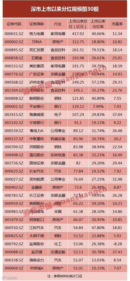 与此同时,深市也涌现了一批长期持续进行现金分红的上市公司,其中较为突出的分红案例包括: