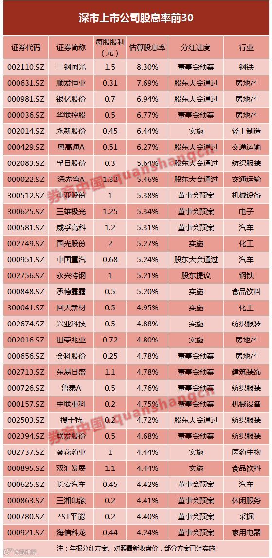 紧跟在三钢闽光之后,房地产板块中的顺发恒业、银亿股份和华联控股当前也具有较高股息率,分别计划每股派发0.31元、0.7元和0.5元,对应股息率达到7.69%、6.94%和6.77%,位居深市第二至第四名。