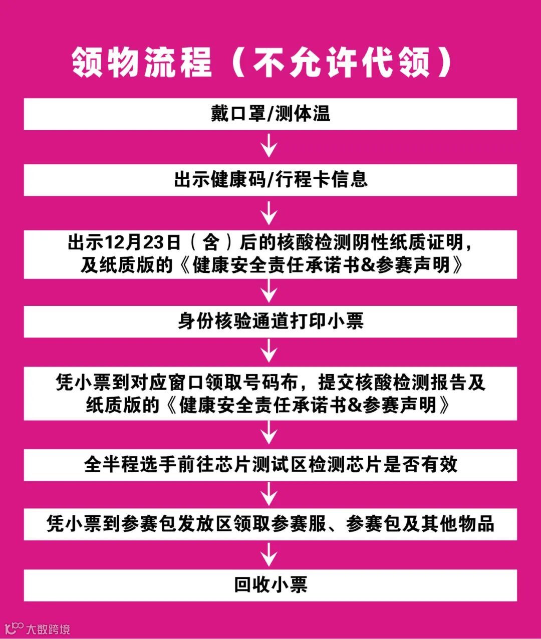2. 参赛物品仅限报名选手本人领取,不可他人代领。未在以上规定时间内领取的参赛物品,组委会将不予补发、保存以及寄送;