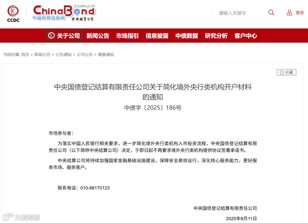 8月11日,中央国债登记结算有限责任公司发布公告称,为落实中国人民银行相关要求,进一步简化境外央行类机构入市投资流程,中央国债登记结算有限责任公司(下称“中央结算公司”)决定,于即日起不再要求境外央行类机构提供协议签署承诺书。