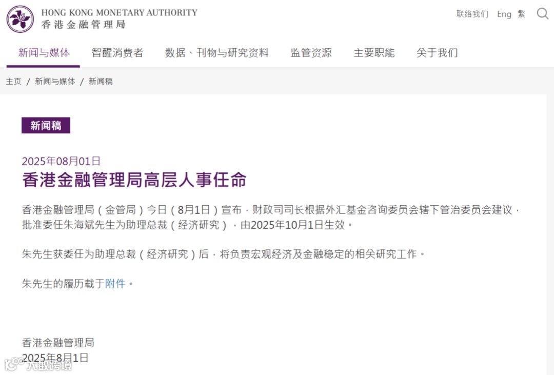 据香港金管局官网8月1日消息,香港特区政府财政司司长根据外汇基金咨询委员会辖下管治委员会建议,批准委任朱海斌为助理总裁(经济研究),任命将于2025年10月1日生效。香港金管局指出,朱海斌获委任为助理总裁(经济研究)后,将负责宏观经济及金融稳定的相关研究工作。