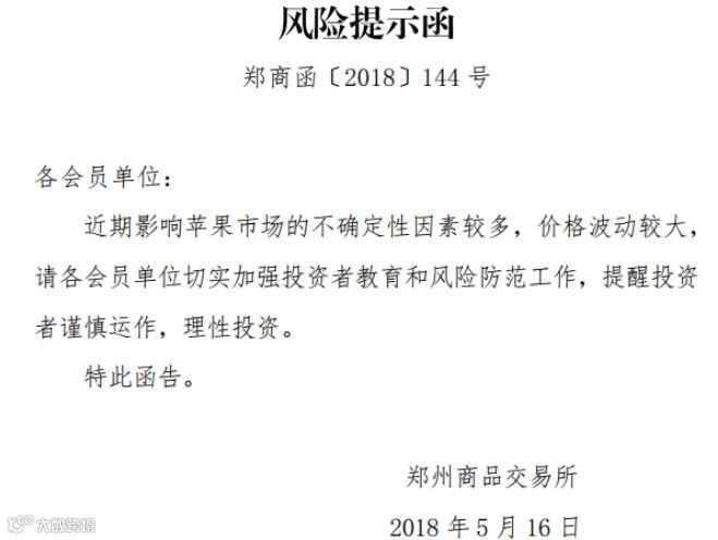 连续大幅上涨,成交持仓比超过10倍,面对这样的苹果期货市场,交易所又出手了。5月16日下午,郑商所首先发布《风险提示函》称,郑商所:近期影响苹果市场的不确定性因素较多,价格波动较大,请各会员单位切实加强投资者教育和风险防范工作,提醒投资者谨慎运作,理性投资。
