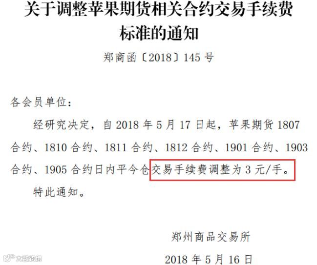 就在市场还在仔细体会《风险提示函》精神的时候,郑商所再下一道调控金牌,宣布自 2018 年 5 月 17 日起,苹果期货 1807 合约、1810 合约、1811 合约、1812 合约、1901 合约、1903 合约、1905 合约日内平今仓交易手续费调整为3元/手。