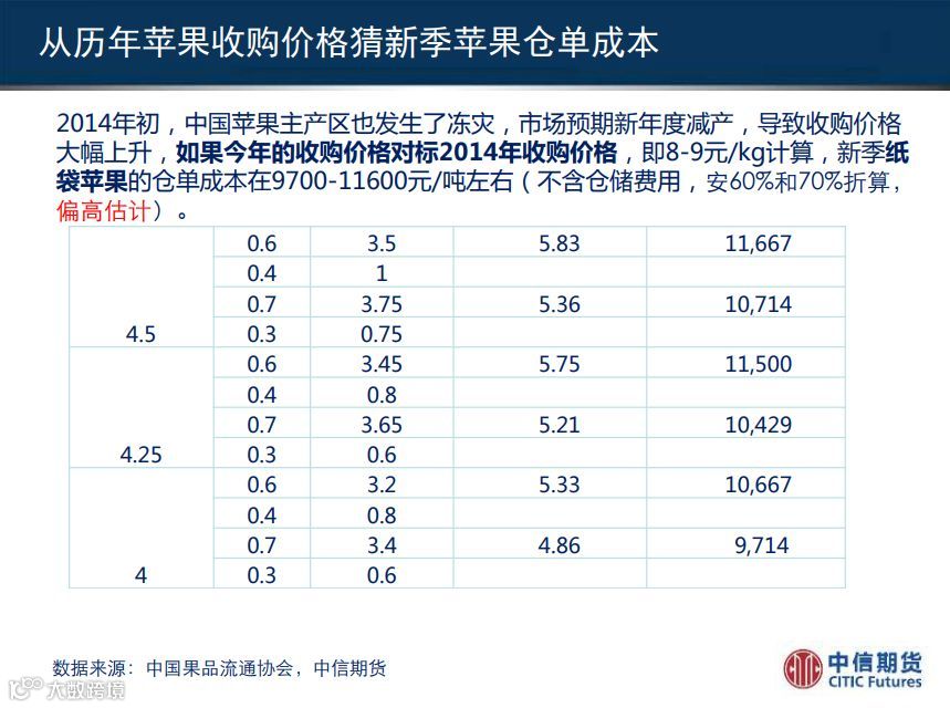 苹果期货价格未来会如何演变?对新季苹果价格进行预估是重要一环,再以此推算期货标准仓单和期货价格。高旺认为,14年也有倒春寒,导致价格比较高,如果对标14年8-9元/公斤,新季纸袋苹果的仓单成本在9700-11600元/吨左右(不含仓储费用)。