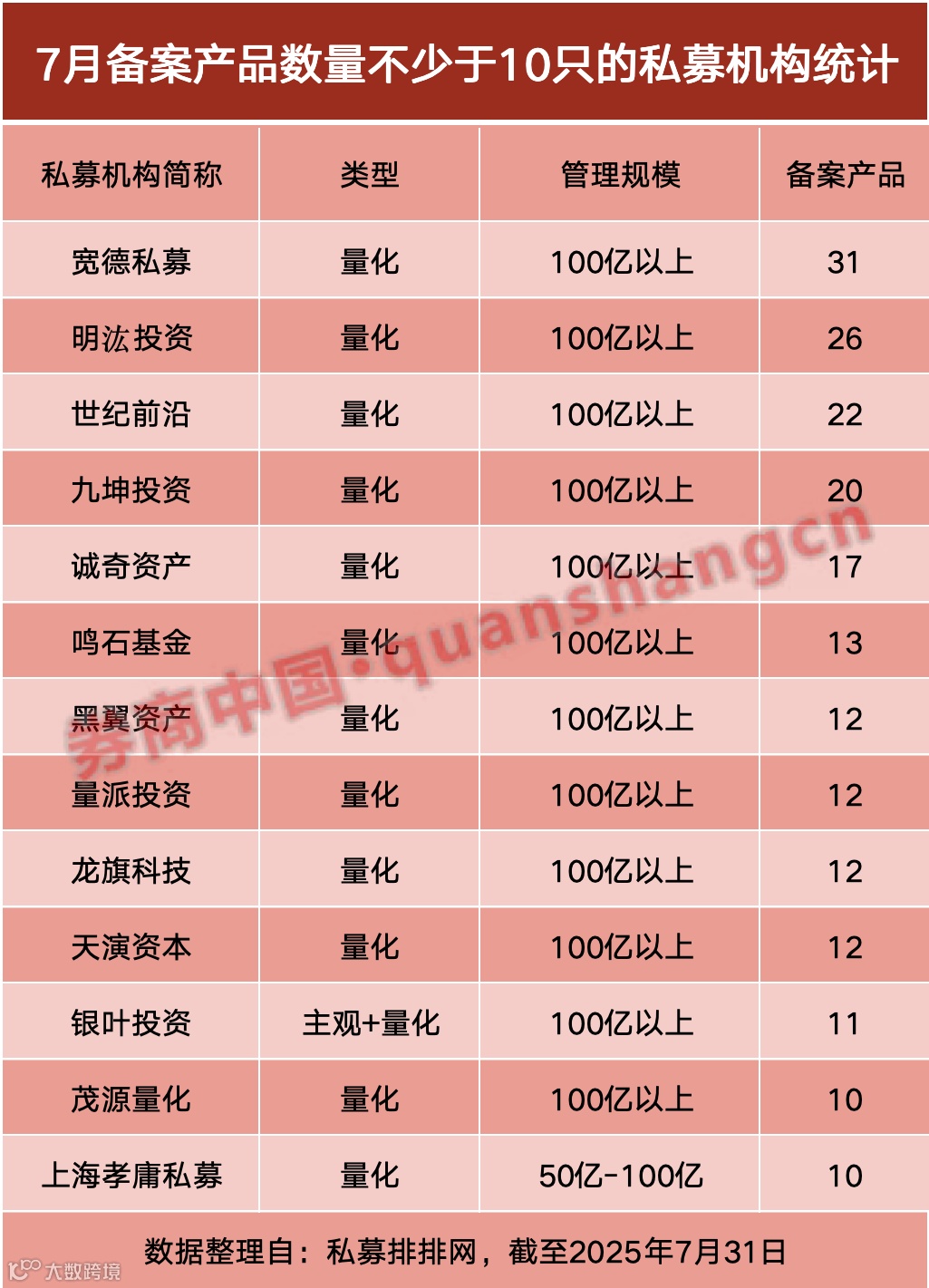 此外,诚奇资产、鸣石基金、黑翼资产、量派投资、龙旗科技、天演资本和银叶投资等私募7月备案量均超过10只,另外2家备案产品数量不少于10只的是百亿混合私募茂源量化和50亿—100亿规模的量化私募上海孝庸私募。