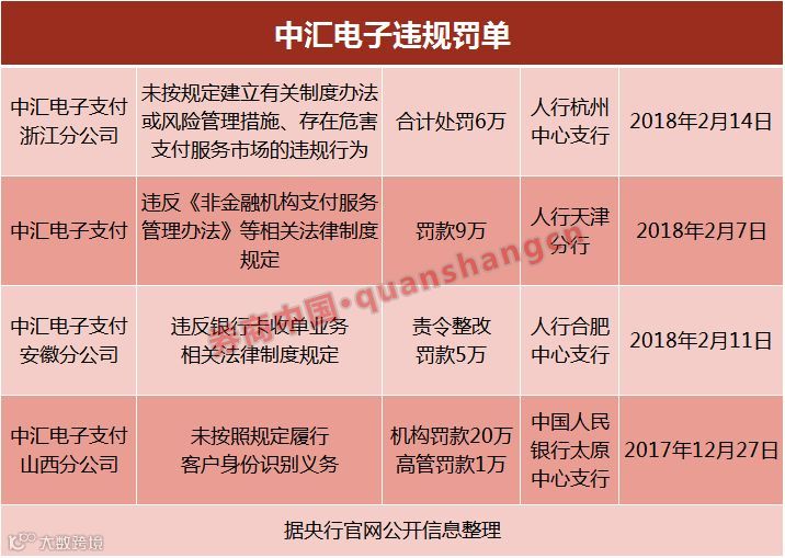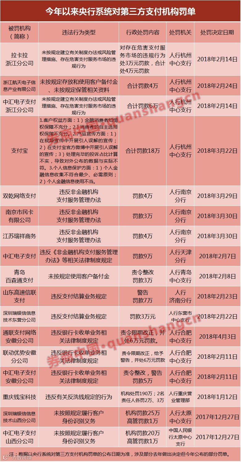 券商中国记者不完全统计,今年以来,央行各分行、支行公布的第三方机构罚单至少已有17张,14家支付公司“踩雷”,其中,中汇电子支付有限公司及旗下三家分公司,更是收到4张罚单;这之中,机构和个人罚金累积324万元。
