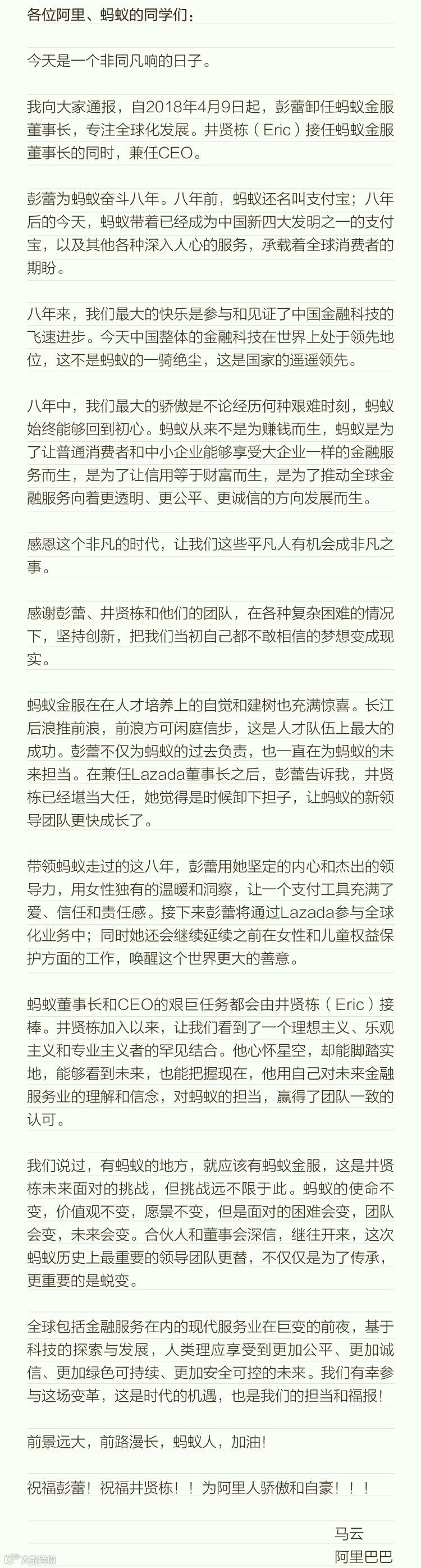 马云内部信评价称,“这是蚂蚁历史上最重要的领导团队更替,不仅仅是为了传承,更重要的是蜕变。长江后浪推前浪,前浪方可闲庭信步,这是人才队伍上最大的成功。”