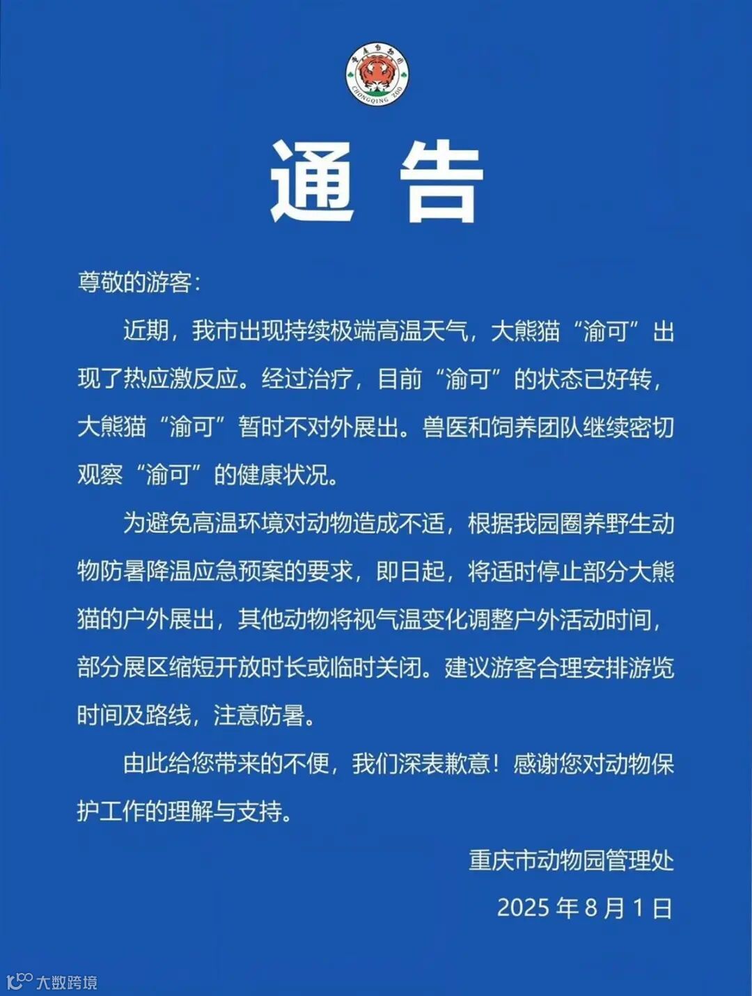 8月1日,重庆市动物园管理处发布官方通报,对该情况作出详细说明。通报指出,近期重庆市出现持续极端高温天气,大熊猫“渝可”出现热应激反应。经过治疗,目前“渝可”的状态已好转,大熊猫“渝可”暂时不对外展出。兽医和饲养团队继续密切观察“渝可”的健康状况。