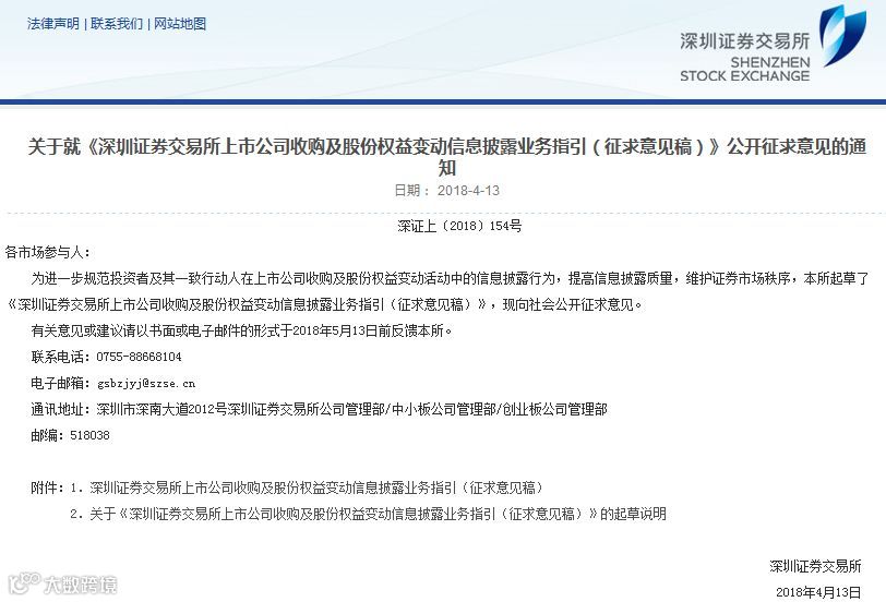 “拥有上市公司股份达到或超过已发行股份的5%后,每增加或减少1%的,应当立即通知上市公司”,4月13日,上交所发布《上市公司收购及股份权益变动信息披露》业务指引(征求意见稿),其中最引人关注的就是这一变化。同时,深交所也发布了公开征求意见通知。
