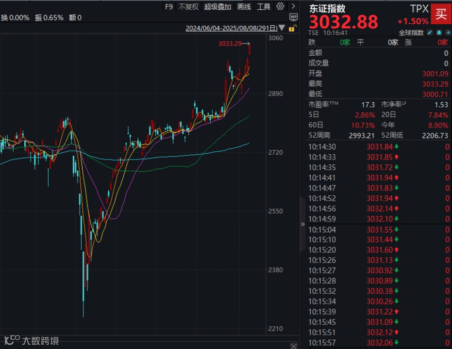 随着美联储降息预期升温以及投资者对美国关税担忧的缓解,日本股市今日(8日)早盘高开高走,日本东证指数涨1.5%并首次突破3000点大关,创下历史新高。自4月8日启动本轮反弹行情以来,日本东证指数累计涨幅已超过32%。个股方面,软银集团今日盘中大涨超12%,索尼涨超6%。