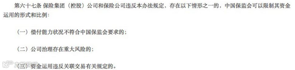 《办法》第六十七条规定,保险集团或控股公司、保险公司违反《办法》,存在三种情形之一的,中国保监会可以限制其资金运用的形式和比例: