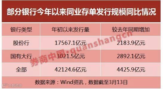 数据显示,年初至今,国有行、股份行同业存单发行规模分别较去年同期增加2892.1亿元和2183.9亿元,其中国有行同存发行规模相当于去年同期的22倍,而整个同业存单市场同期发行增量也不过4425.9亿元。