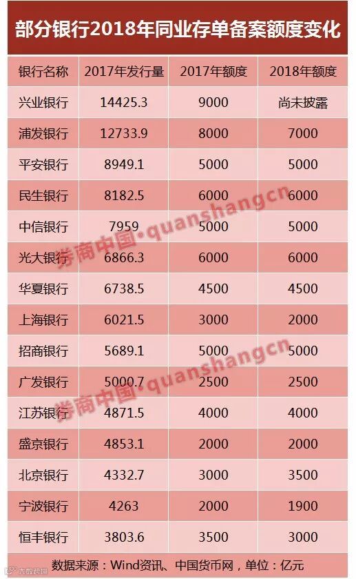 值得注意的是,绝大部分前期发行量较大的银行2018年备案额度都较去年持平甚至缩减。数据显示,去年同业发行量最大的15家银行(含10家股份行、5家城商行)中,除兴业外均已披露2018年备案额度,前述银行合计备案额度较2017年减少2100亿元。