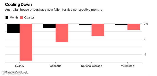 澳大利亚2月份房价连续第5个月下跌,进一步表明房地产繁荣已经结束,考虑到信贷环境的收紧、利率上升,贸易条件的收紧,资产价格有进一步调整的空间。