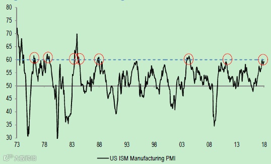 就这一时刻,全球部分主要经济体制造业PMI已经面临了全面下滑危机,主要生产国(中国、德国及日本)及资源国(澳大利亚及俄罗斯)回落。尽管美国站上了60,但是根据JP摩根的一项研究表明,美国PMI指数历史上很难长期超过60。以往的历史表明,每次站上60之后不久,就面临下滑。