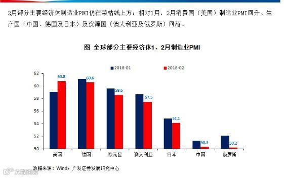 就在全球贸易战一触即发的时刻,全球部分主要经济体制造业PMI已经面临了全面下滑危机。统计显示,虽然2月部分主要经济体制造业PMI仍在荣枯线上方,但是相对1月,主要生产国(中国、德国及日本)及资源国(澳大利亚及俄罗斯)回落。