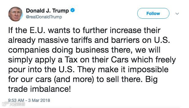 特朗普周六在Twitter上发文称,美国和欧盟之间存在“严重的不平衡”,如果28国集团坚持对美国商品征收惩罚性关税,美国将采用报复性关税对欧盟汽车出口进行反击。