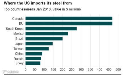 这一项被认为是针对中国贸易的举措却率先“触怒”了一众美国盟友,其中欧盟态度最为强硬。其实,在钢铁问题上,中国不是美国最大的“威胁”,美国钢铁的最大进口来源国家是加拿大和欧盟。从总量上看,欧盟和加拿大对美出口量差不多。