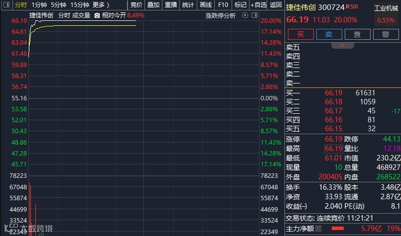 个股方面,开盘仅十多分钟,捷佳伟创就被不少大单拉升至20cm涨停;紧跟其后,文科股份、双良节能也直线拉升涨停,海优新材盘中也一度触及20cm涨停,目前涨幅仍超过15%。大全能源、阳光电源、爱旭股份、固德威、晶盛机电、杉杉股份等光伏概念股也有拉升动作。