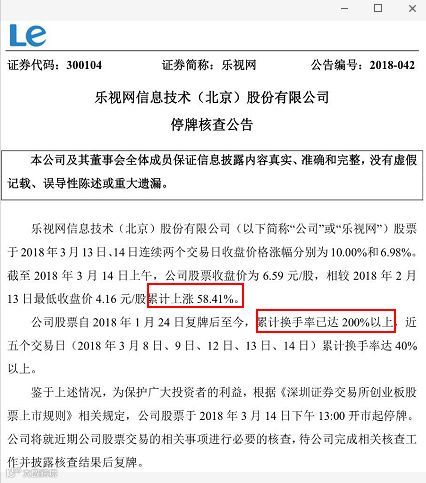 乐视网股票自2018年1月24日复牌后至今,累计换手率已达200%以上,近五个交易日(2018年3月8日、9日、12日、13日、14日)累计换手率达40%以上。为保护广大投资者的利益,根据《深圳证券交易所创业板股票上市规则》相关规定,公司股票于2018年3月14日下午13:00开市起停牌。乐视网将就近期公司股票交易的相关事项进行必要的核查,待公司完成相关核查工作并披露核查结果后复牌。