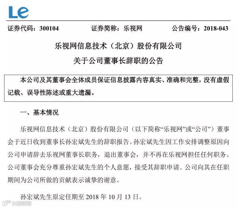 今天,乐视网公告称,董事会于近日收到董事长孙宏斌先生的辞职报告。孙宏斌先生因工作安排调整原因向公司申请辞去乐视网董事长职务,退出董事会,并不再在乐视网担任任何职务。公司董事会充分尊重孙宏斌先生的个人意愿,接受其辞职申请。公司向其在任职期间为公司所做的贡献表示诚挚的谢意。