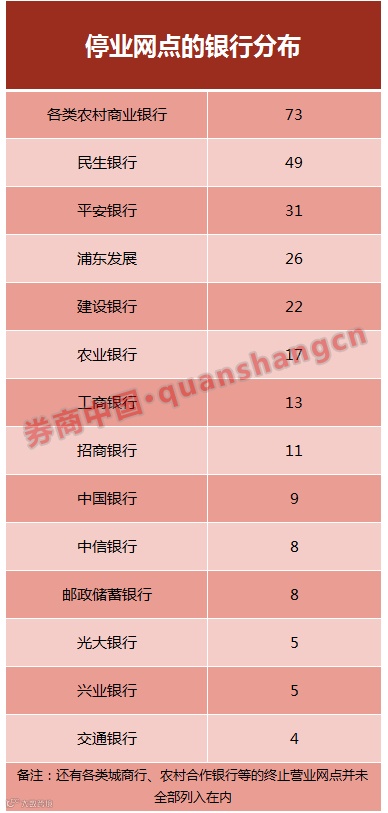 不过,部分农商行人员在扩张,但是部分线下营业网点却似乎越开越少。券商中国记者统计,过去近4个月,来自各类农村商业银行关停网点数达到了73家,相比其它银行关停网点数(民生银行49家、平安银行31家、浦发银行26家、建设银行22家、农业银行17家、工商银行17家、招商银行11家、中国银行9家、邮储银行8家),各类农商行属于关停网点数量最多的。