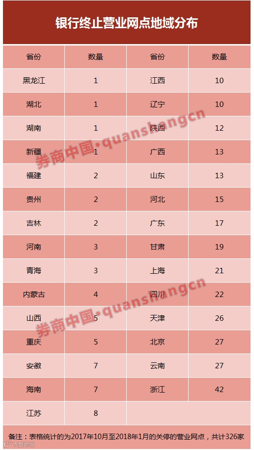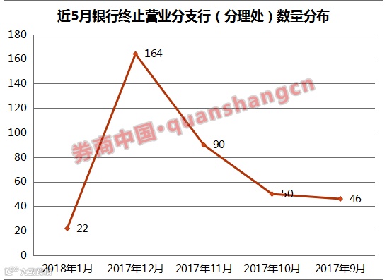 过去近4个月来,五大行、股份行、城商行、农商行(含农合社)、外资行的营业网点关停数326家,2018年1月是22家,2017年12月是164家,2017年11月是90家,2017年10月是50家。