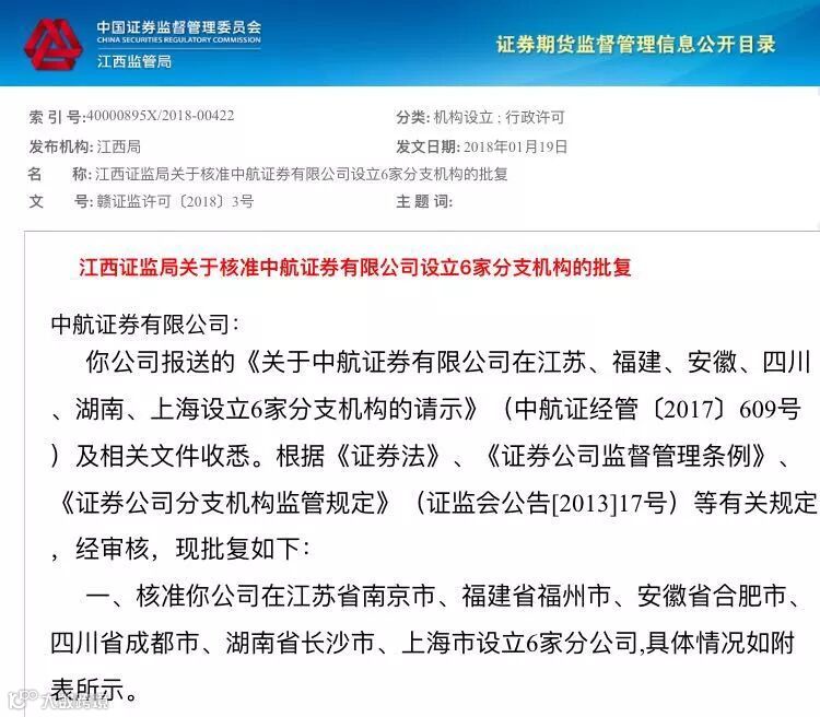 1月19日,江西证监局公布,核准中航证券在江苏省南京市、福建省福州市、安徽省合肥市、四川省成都市、湖南省长沙市、上海市设立6家分公司,业务范围包括:证券经纪;证券投资咨询;与证券交易、证券投资活动有关的财务顾问;证券承销与保荐(仅限项目推介与承揽);证券投资基金代销;融资融券;代销金融产品;为期货公司提供中间业务。