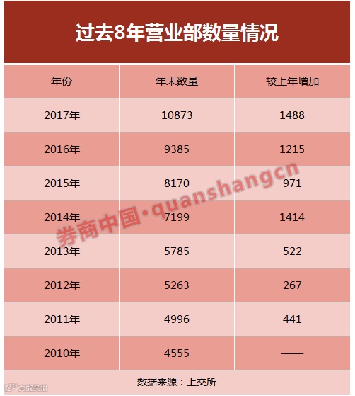 2013年新设分支机构政策放宽后,券商开始加急跑马圈地。上交所数据显示, 2013年末,全国共有5785家营业部,2014年新增1414家,至2014年末全国营业部数量增加到7199家。2015年末,全国营业部数量进一步增加至8170家。2016年末,增至9385家。2017年,券商跑马圈地更急,全国营业部数量较2016年增加1488家至10873家。2017年成为过去营业部数量增加最多的一年。