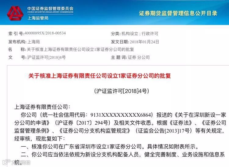 同日,上海证监局公布,核准上海证券在广东省深圳市设立1家证券分公司,业务范围包括证券经纪;证券投资咨询;证券投资基金代销;融资融券业务;与证券交易、证券投资活动有关的财务顾问业务;代销金融产品业务;证券资产管理(限承揽);证券(不含股票、上市公司发行的公司债券)承销(限承揽)。