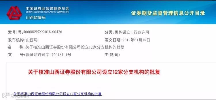 1月18日,山西证监局公布,核准山西证券设立12家营业部,分别在山西省太原市、山西省晋城市阳城县、山西省晋中市祁县、山西省晋中市太谷县、江苏省苏州市、山东省青岛市、山东省潍坊市、河南省郑州市各设立1家证券营业部;核准在山西省朔州市、重庆市各设立2家证券营业部,信息系统建设模式均为C型。