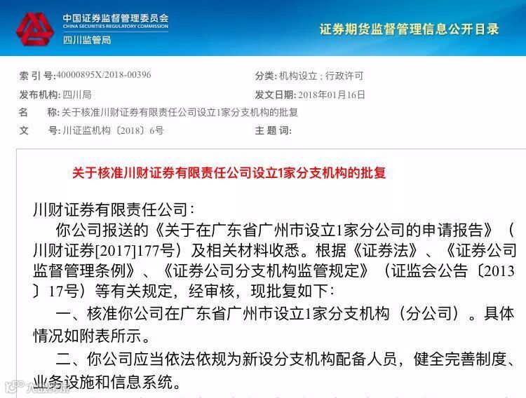 1月16日,四川证监局官网公布,川财证券获准在广东省广州市设立1家分公司。