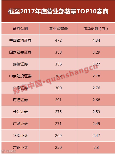上交所数据显示,截至2017年末,营业部数量最多的十家券商为中国银河证券、国泰君安证券、安信证券、中信建投证券、中泰证券、海通证券、长江证券、广发证券、华泰证券和方正证券。