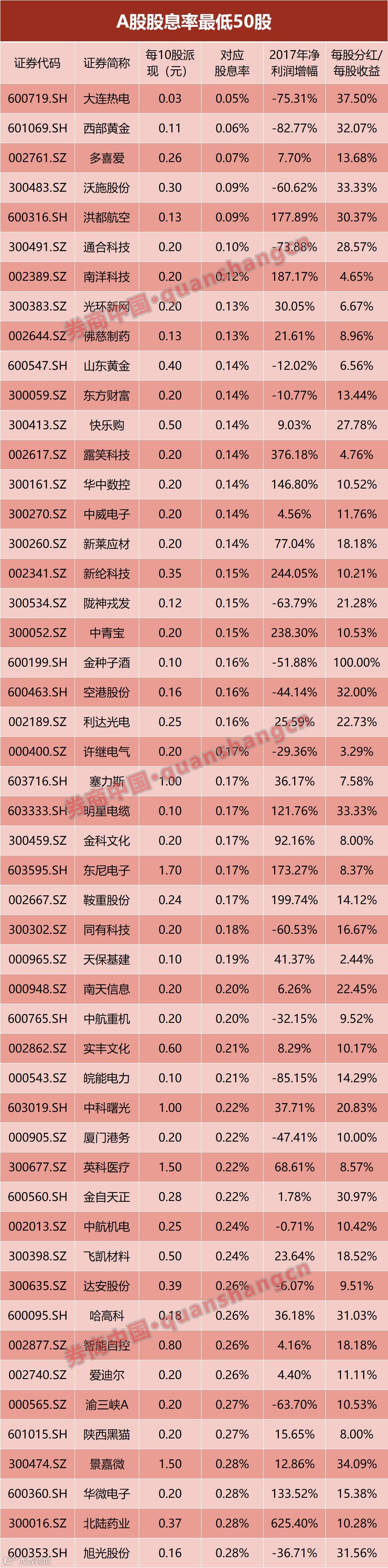 其中,还有126的股息率低于0.5%,30股股息率低于0.2%,大连热电、西部黄金、多喜爱、沃施股份和洪都航空等5股的对应股息率低于0.1%。