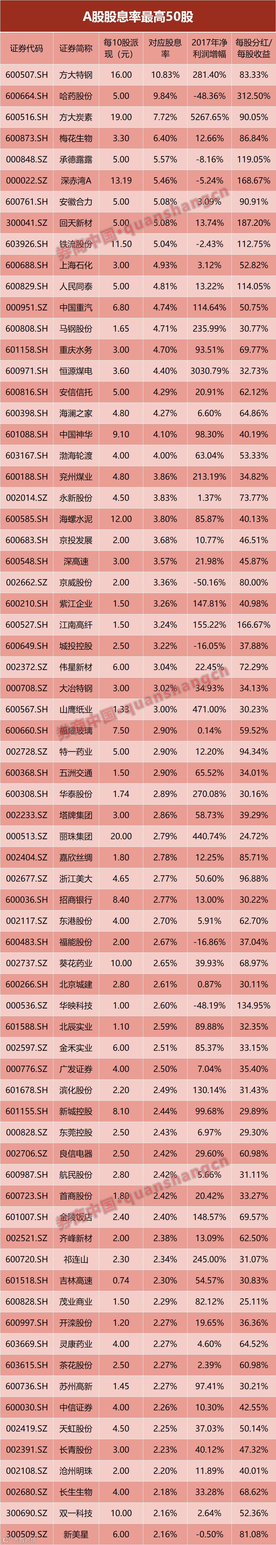 尽管多数公司的股息回报都不够让人满意,但A股市场仍有一批上市公司坚持高分红、积极回报股东,参照当前股价,目前两市共有9股的股息率超过5%,方大特钢、哈药股份、方大炭素和梅花生物的股息率超过6%。