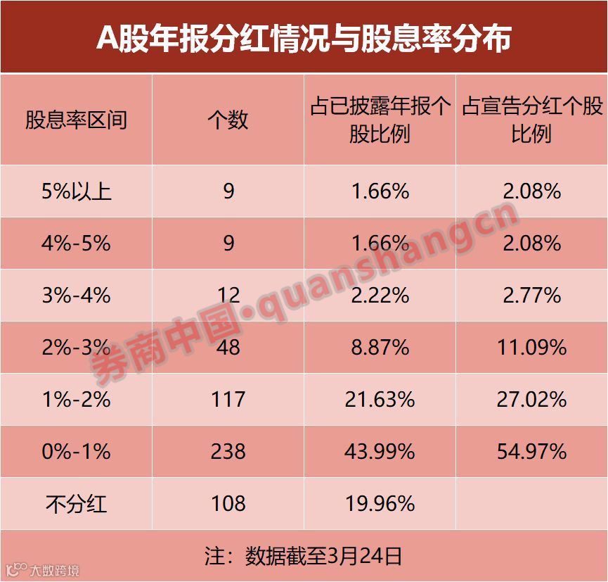 不过,在上述433份股息分配方案中,有403股的对应股息率低于3%,占全体分配方案的93.07%;有238股的对应股息率不足1%,占全体分配方案的54.97%,整体带来的股息回报并不算高。