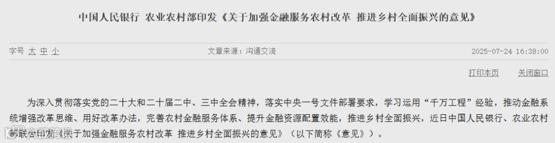 为完善农村金融服务体系、提升金融资源配置效能,中国人民银行、农业农村部7月24日联合印发《关于加强金融服务农村改革 推进乡村全面振兴的意见》(下称《意见》),