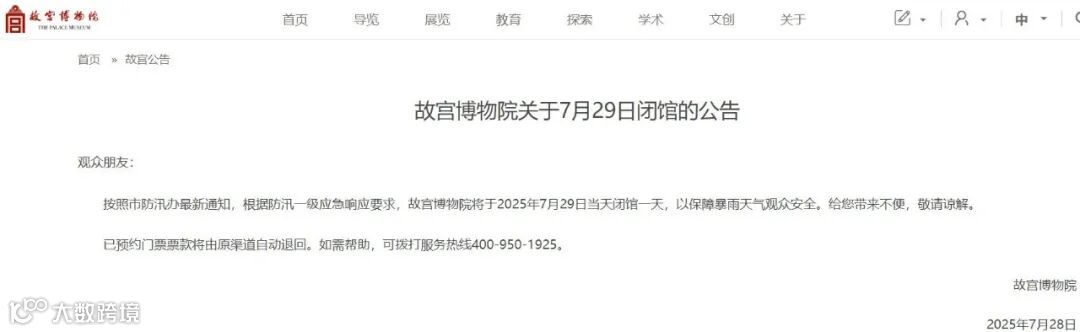 7月28日,故宫博物院发布公告,按照北京市防汛办最新通知,根据防汛一级应急响应要求,故宫博物院于7月29日当天闭馆一天,以保障暴雨天气观众安全。已预约门票票款将由原渠道自动退回。如需帮助,可拨打服务热线400-950-1925。