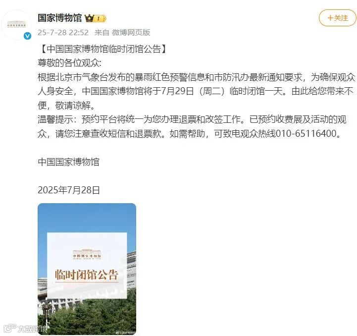 同日,国家博物馆发布临时闭馆公告,根据北京市气象台发布的暴雨红色预警信息和市防汛办最新通知要求,为确保观众人身安全,中国国家博物馆于7月29日(周二)临时闭馆一天。预约平台将统一办理退票和改签工作。已预约收费展及活动的观众,请注意查收短信和退票款。如需帮助,可致电观众热线010-65116400。