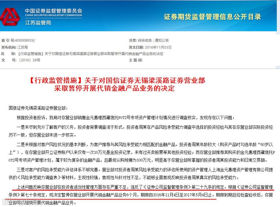 2016年11月,国信证券无锡梁溪路证券营业部因“投资者适当性管理方面存在严重不足”,被江苏证监局暂停开展代销金融产品业务半年,期限自2016年11月4日至2017年5月4日止。