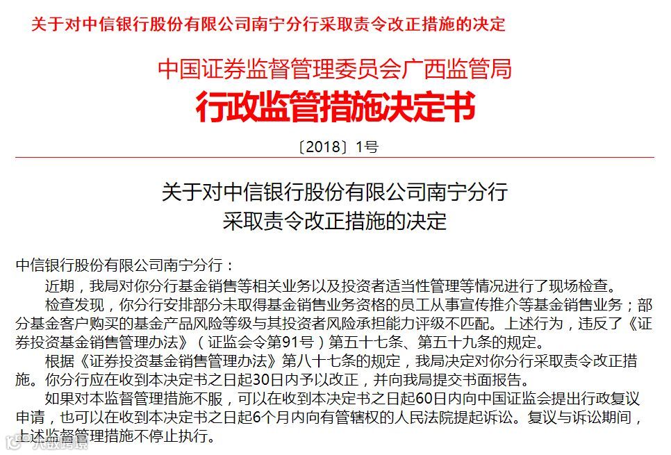 今日晚间,广西证监局公布最新罚单,中信银行南宁分行由于“安排部分未取得基金销售业务资格的员工从事宣传推介等基金销售业务;部分基金客户购买的基金产品风险等级与其投资者风险承担能力评级不匹配”等违规行为,被责令改正。